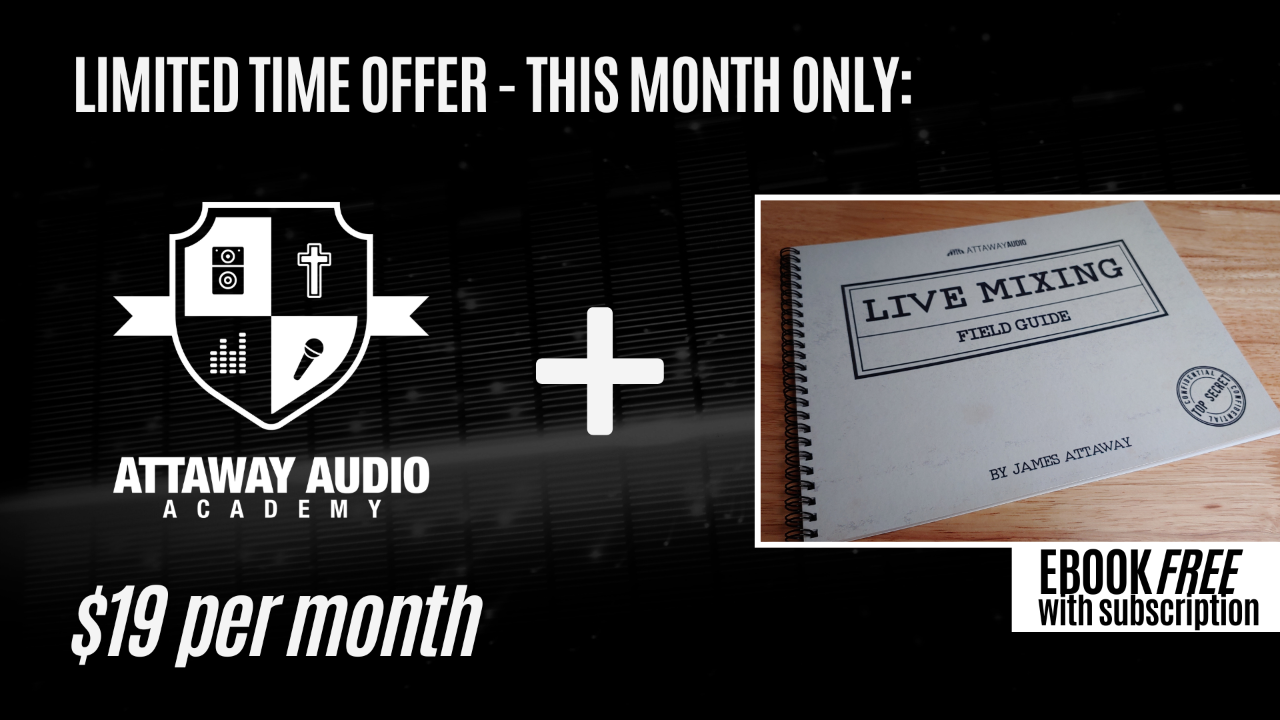 For this month only, sign up for the Attaway Audio Academy and get a copy of the Live Mixing Field Guide eBook FREE. Take the confusion out of EQ, Compression and Effects in your live mixes today.